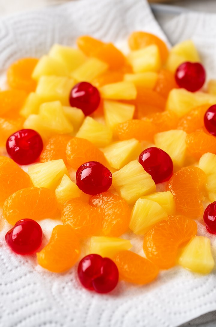 - Drain your canned fruits thoroughly and blot with paper towels — excess liquid will make the salad watery and thin out the cream.