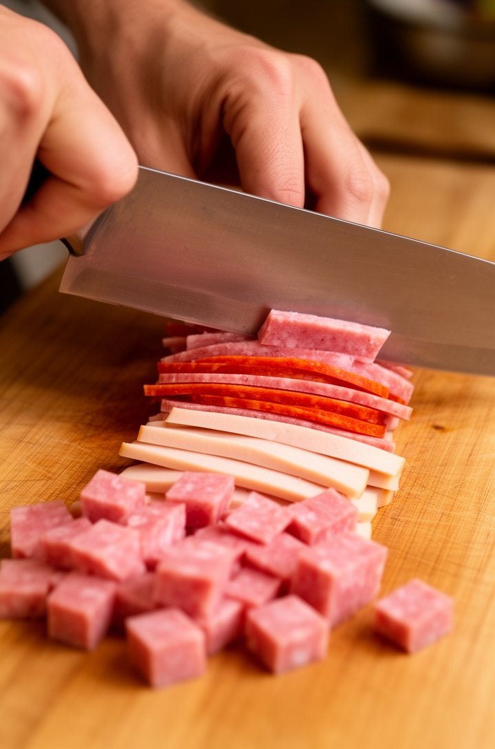 - Chop everything into similar-sized pieces so you get a bit of meat, cheese, and veggie in every forkful.