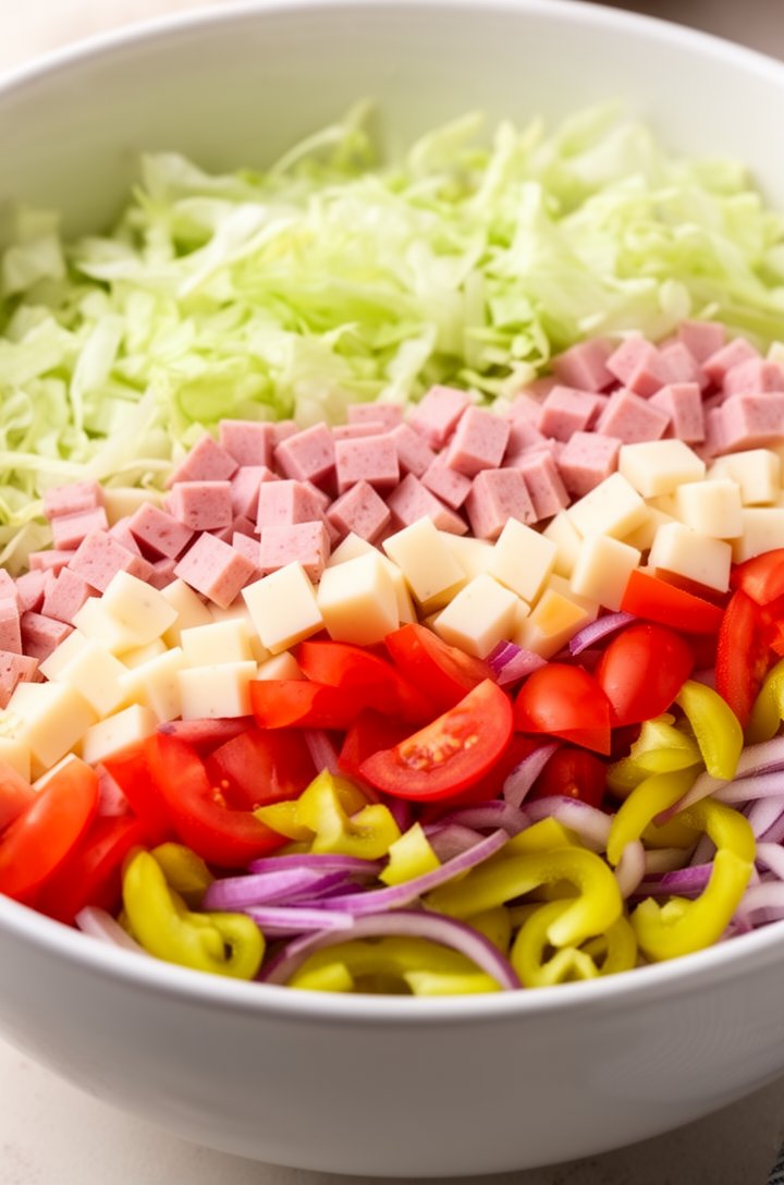 The secret weapon here is the dressing. It's a creamy blend of mayo, red wine vinegar, and a splash of banana pepper juice straight from the jar. That pepper brine adds a tangy, slightly spicy undertone that makes the whole salad taste like a proper Italian grinder shop made it.