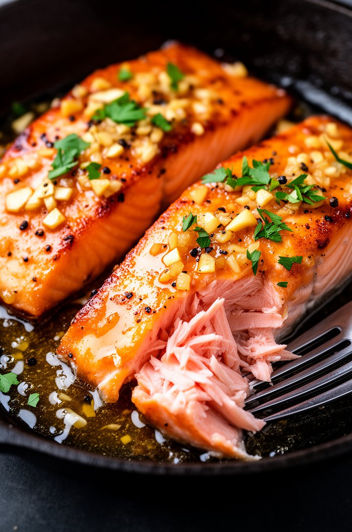 This honey garlic salmon is one of those recipes that looks like you spent an hour in the kitchen but actually comes together in about 20 minutes. The fillets get a quick sear in a buttery honey-garlic sauce, then a blast under the broiler caramelizes everything into a sticky, irresistible glaze. It's sweet, savory, garlicky, and just a touch spicy — basically everything you want on a piece of salmon.