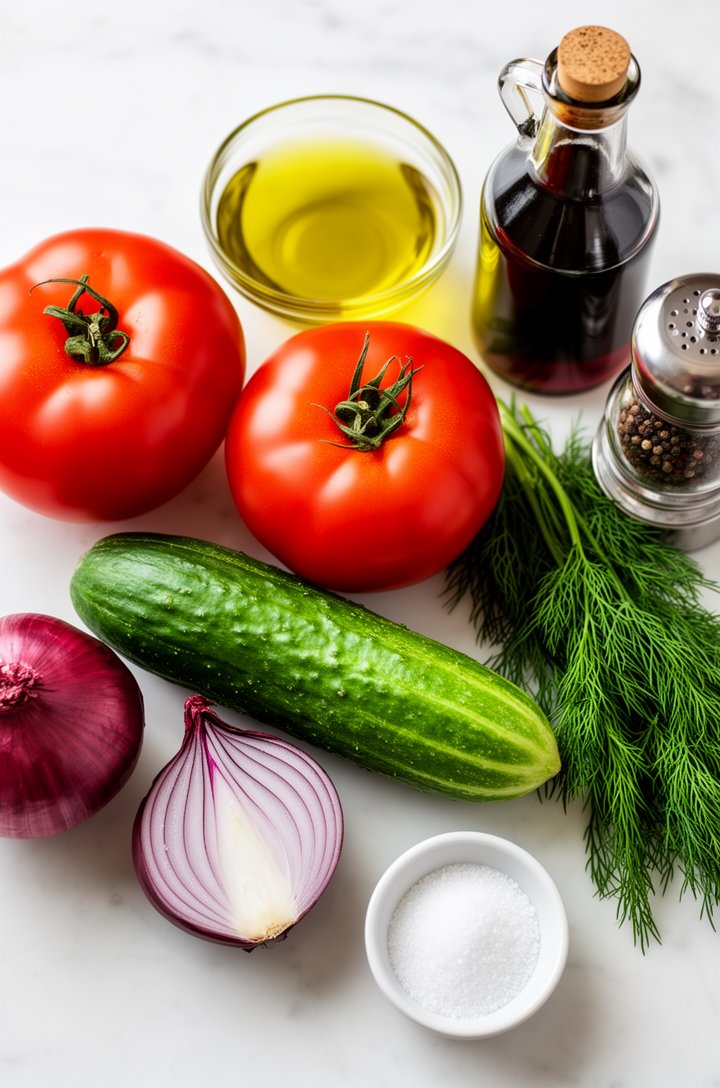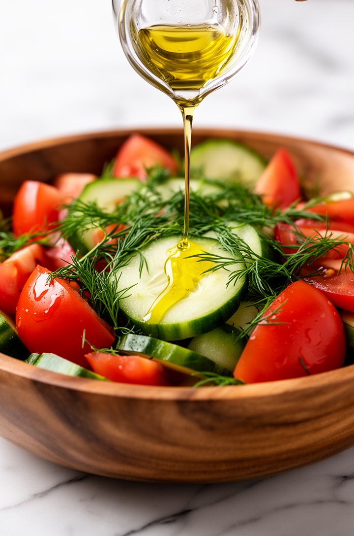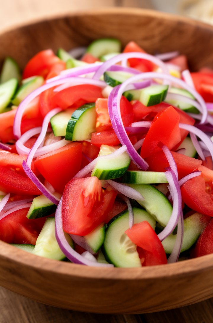 The beauty of a good tomato cucumber salad is that it practically dresses itself. A glug of olive oil, a splash of red wine vinegar, and a generous pinch of salt — that's it. The tomatoes release a little juice as the salad rests, and it mixes with the dressing into something you'll want to soak up with bread. The key is using the ripest, most in-season tomatoes you can find.