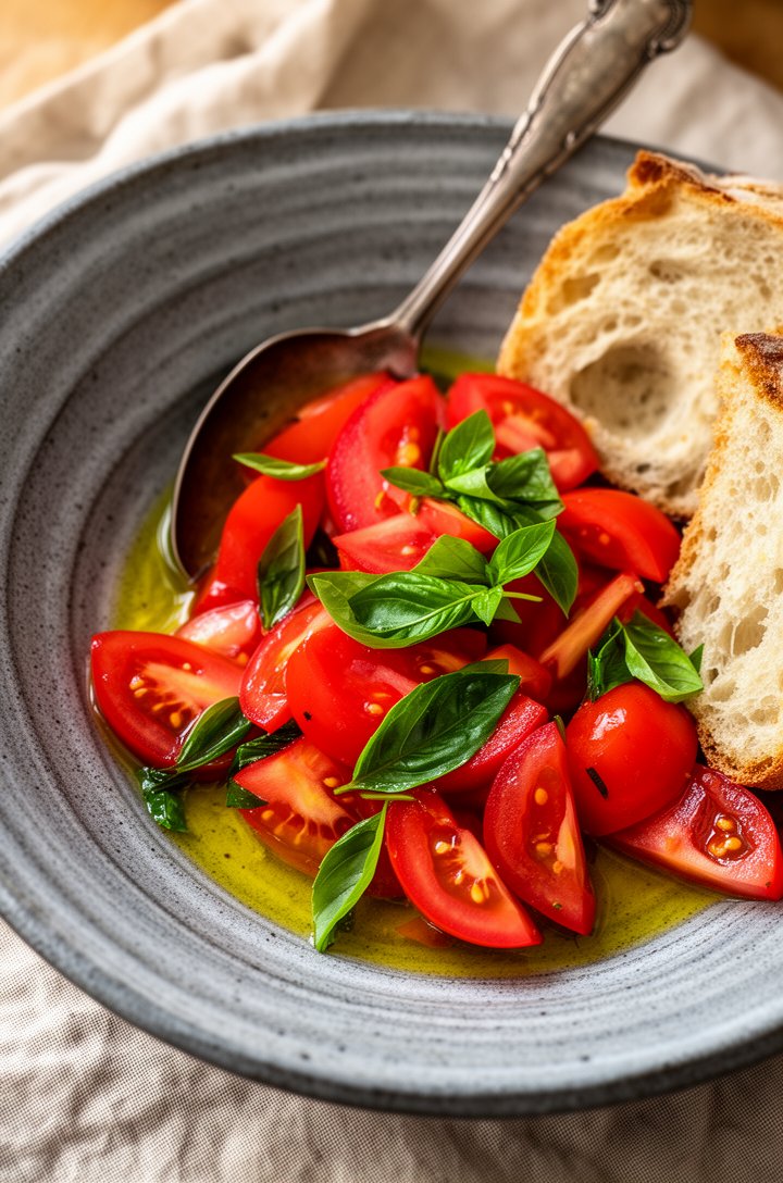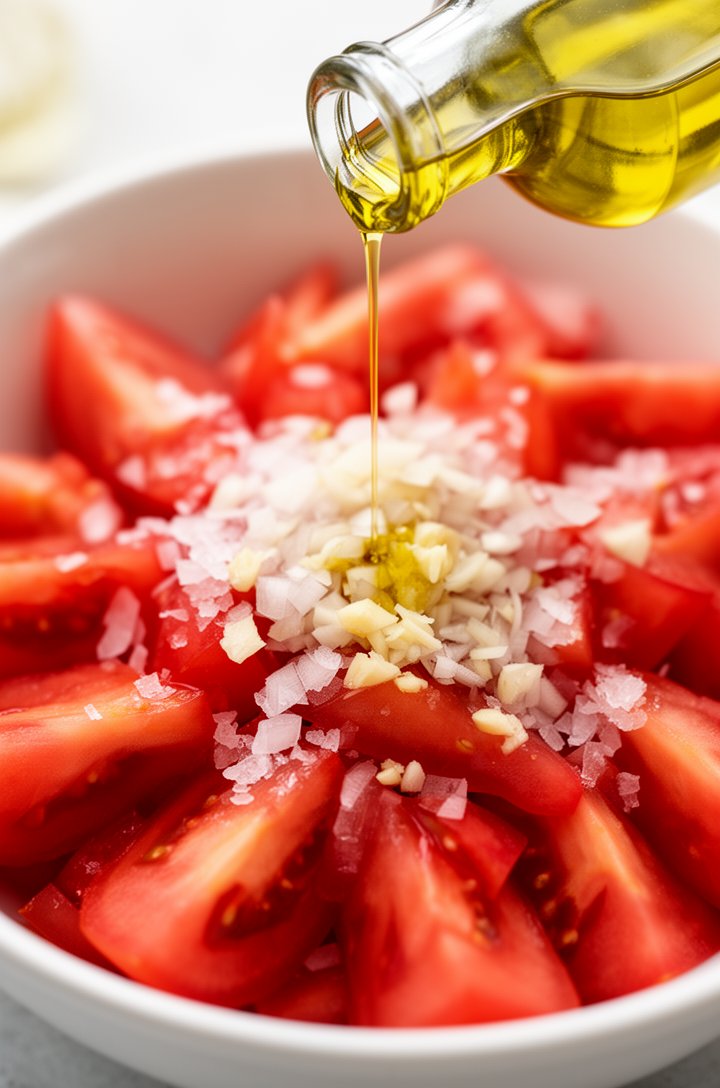 The dressing here is dead simple — good olive oil, a splash of white wine vinegar, a whisper of garlic, and salt. That's it. The tomatoes do the rest, releasing their own juices that mingle with the vinaigrette into something you'll want to mop up with bread.